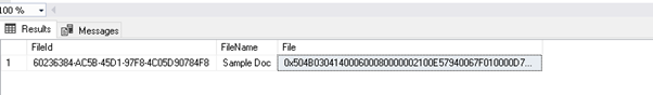 SELECT TOP (1000) [FileId] ,[FileName] ,[File] FROM [FileStreamDemoDB].[dbo].[DemoFileStreamTable_1] |