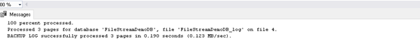 BACKUP LOG [FileStreamDemoDB] TO DISK = N'C:\Program Files\Microsoft SQL Server\MSSQL15.SQL2019\MSSQL\Backup\FileStreamDemoDB.bak' WITH NOFORMAT, NOINIT, NAME = N'FileStreamDemoDB-Full Database Backup', SKIP, NOREWIND, NOUNLOAD, STATS = 10 GO |