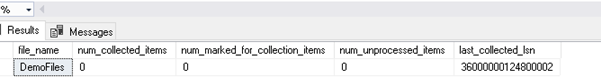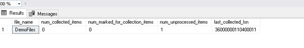 Rerun the transaction log backup and rerun the procedure. We can see that the there are no unprocessed items (num_unprocessed_items=0) and last_collected_lsn is also modified as per the last log backup.