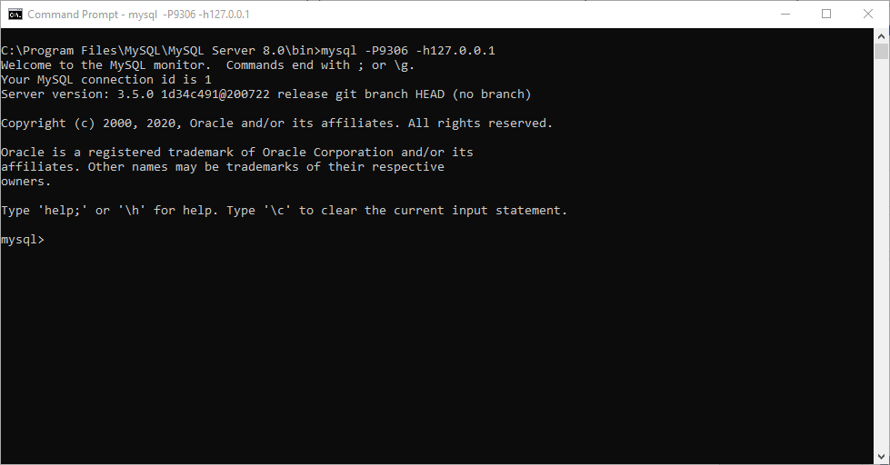 To connect to Manticore search using MySQL console, we should open the command prompt and go to the MySQL binaries directory (in this example the directory is “C:\Program Files\MySQL\MySQL Server 8.0\bin”) and use the following command: