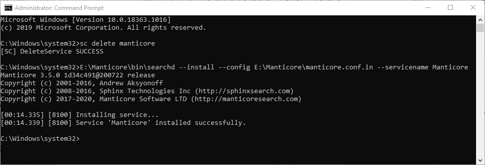 E:\Manticore\bin\searchd –install –config E:\Manticore\manticore.conf.in –servicename Manticore