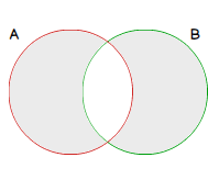 Graphical representation of A∪B is as follows. Set A is represented by red circle while green circle represents Set B. A∪B is the grayscaled parts of those circles. Further representations will use this color usage convention.
