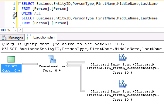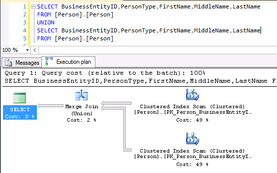 As we can see in the above example, UNION operation is translated to MERGE JOIN operator in SQL Server while UNION ALL operator simply takes up all rows from each set and concatenates it.