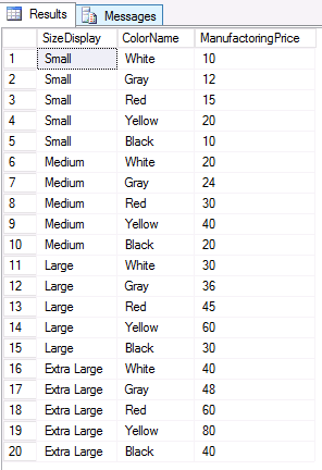 -- Create ClothingSizes table CREATE TABLE ClothingSizes ( SizeDisplay VARCHAR(32), Need4FabricUnits INT ); INSERT INTO ClothingSizes VALUES ('Small',1), ('Medium',2),('Large',3),('Extra Large',4) ; -- Create ClothingColors table CREATE TABLE ClothingColors ( ColorName VARCHAR(32), ColorPrice INT ); -- Generate all combinations INSERT INTO ClothingColors VALUES ('White',10), ('Gray',12), ('Red',15), ('Yellow',20), ('Black',10) ; SELECT cs.SizeDisplay, cc.ColorName, cc.ColorPrice * cs.Need4FabricUnits as ManufactoringPrice FROM ClothingSizes cs, ClothingColors cc -- cleanups DROP TABLE ClothingColors; DROP TABLE ClothingSizes; |