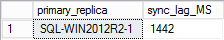 ;WITH AG_Stats AS ( SELECT AR.replica_server_name, HARS.role_desc, Db_name(DRS.database_id) [DBName] FROM sys.dm_hadr_database_replica_states DRS INNER JOIN sys.availability_replicas AR ON DRS.replica_id = AR.replica_id INNER JOIN sys.dm_hadr_availability_replica_states HARS ON AR.group_id = HARS.group_id AND AR.replica_id = HARS.replica_id ), Waits AS ( select wait_type , waiting_tasks_count , wait_time_ms , wait_time_ms/waiting_tasks_count sync_lag_MS from sys.dm_os_wait_stats where waiting_tasks_count >0 and wait_type = 'HADR_SYNC_COMMIT' ), Pri_CommitTime AS ( SELECT replica_server_name , DBName FROM AG_Stats WHERE role_desc = 'PRIMARY' ), Sec_CommitTime AS ( SELECT replica_server_name , DBName FROM AG_Stats WHERE role_desc = 'SECONDARY' ) SELECT p.replica_server_name [primary_replica] , w.sync_lag_MS FROM Pri_CommitTime p CROSS APPLY Waits w |