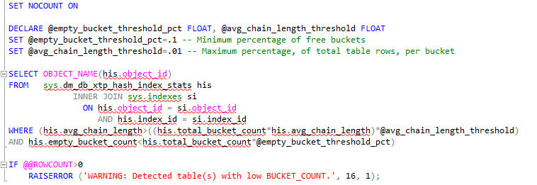 When creating a hash index in a memory optimized table we need to define a value for the bucket count. Think twice before set a random value, you may pay the price later… On this article we will explain the effects of a bad defined bucket count and how to monitor it.