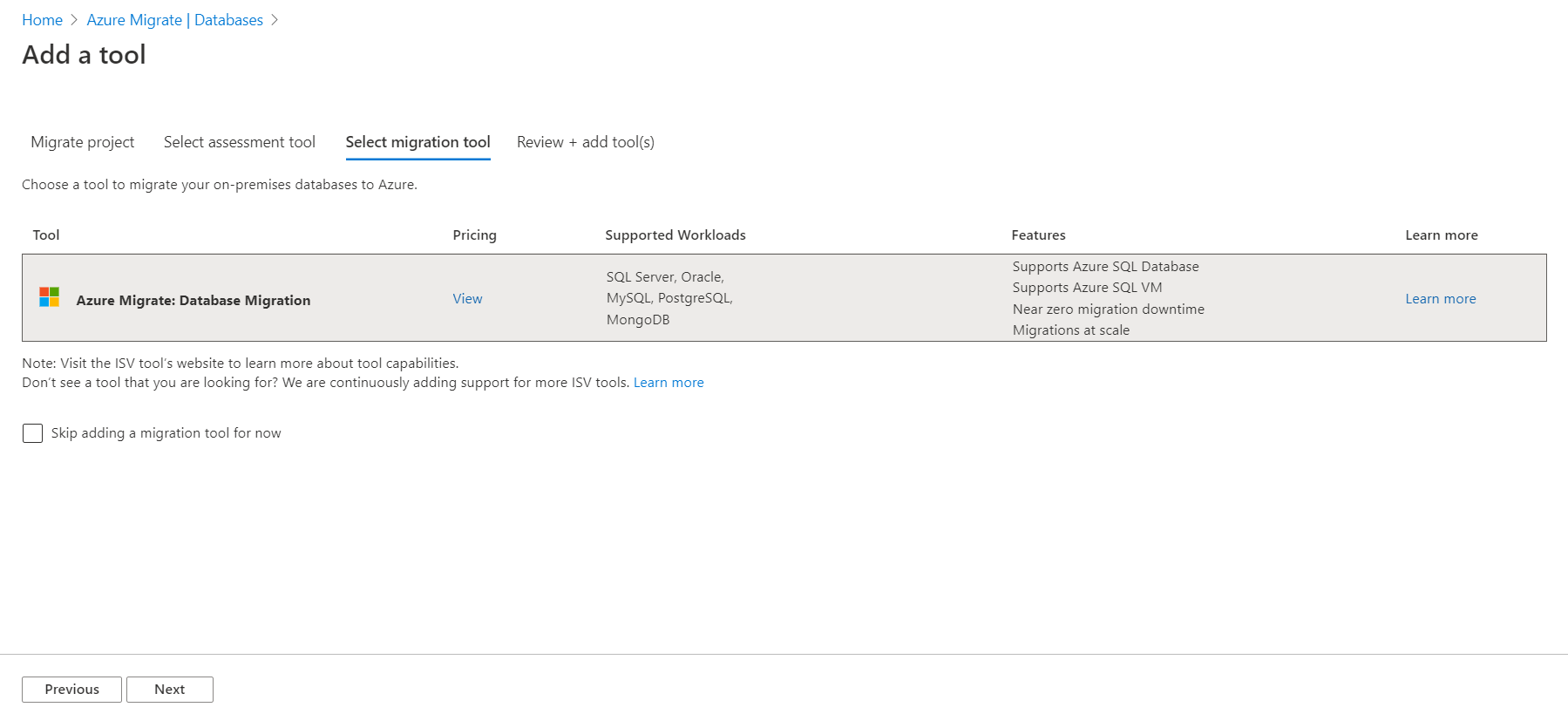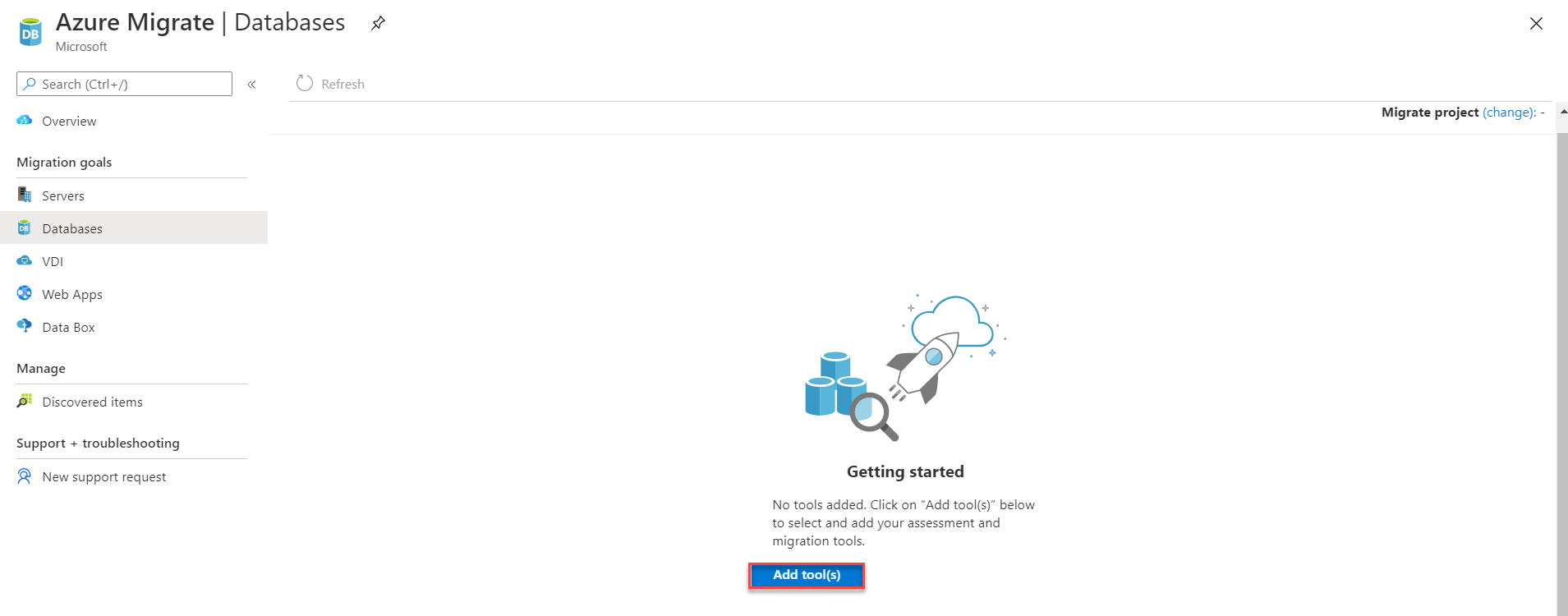 From the Azure Migrate: Databases window, click on Add tool(s) option to select the tools that will be used to assess and migrate the databases, as below: