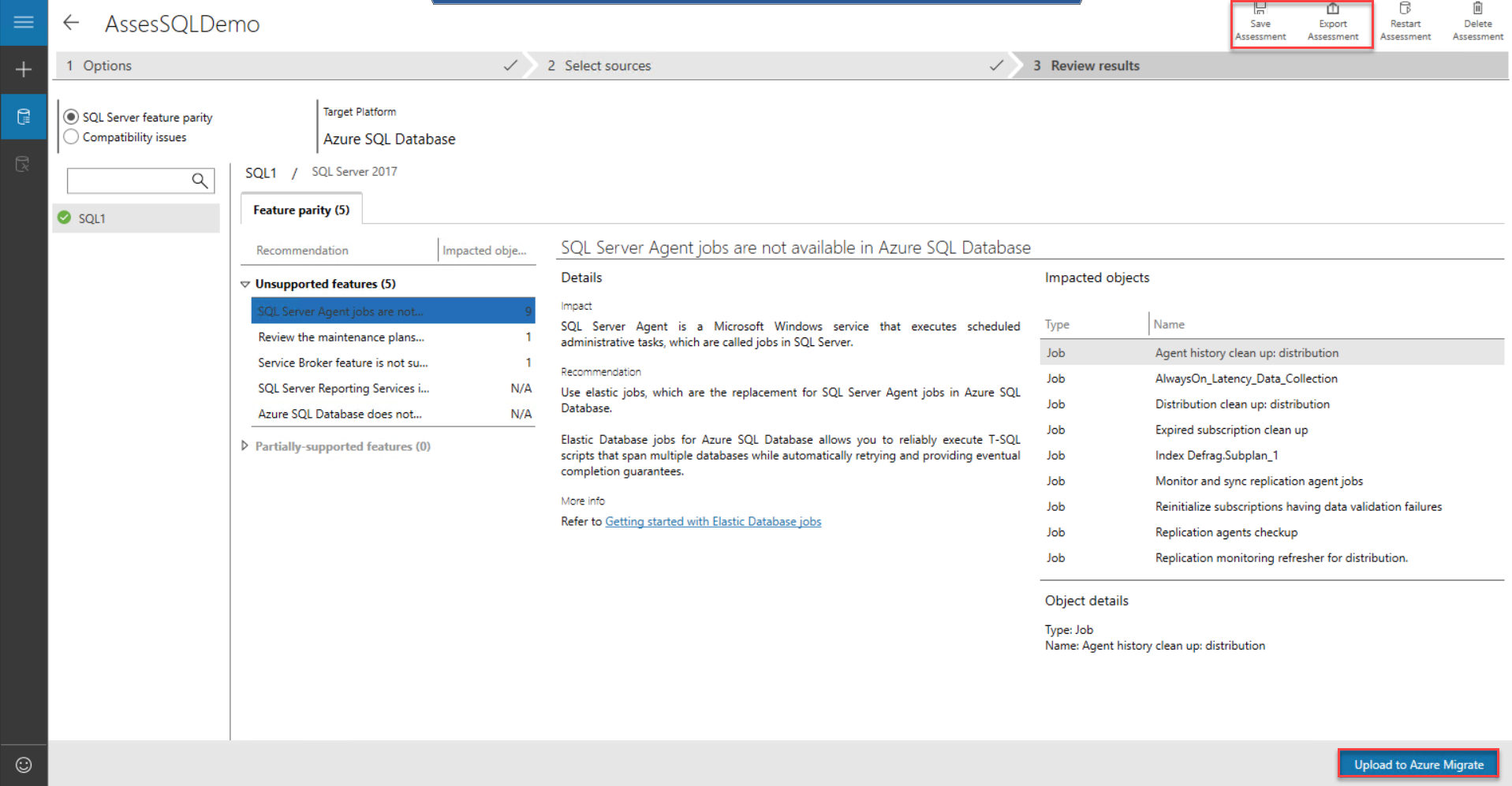 Once the assessment process completed successfully, review the list of breaking points and unsupported features that are provided by the Data Migration Assistant, with the ability to save the assessment result, export it or upload it to Azure Migrate tool, as shown below: