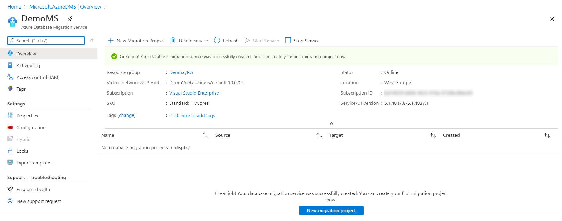 Now we are ready to create a new instance of Azure Database Migration Service.