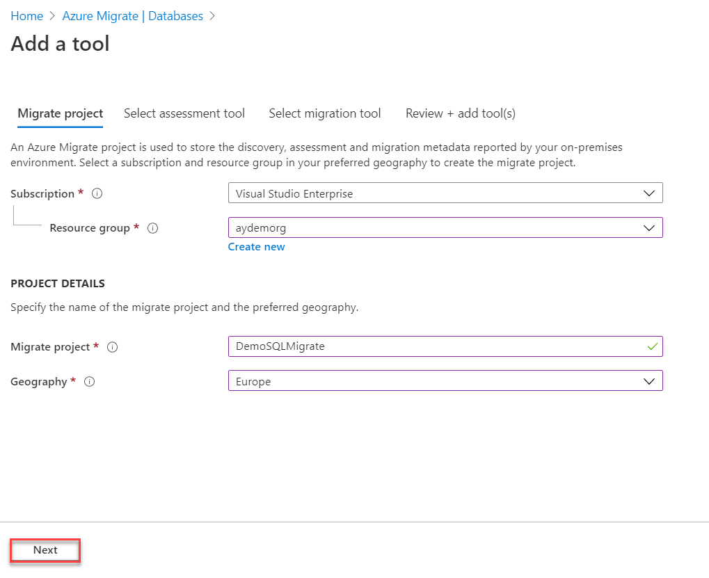 In the Migrate Project section of the Add a Tool window, provide the subscription under which the project will be created, the resource group name, a unique name for the project and the nearest geography where this project will be created, then click Next to continue: