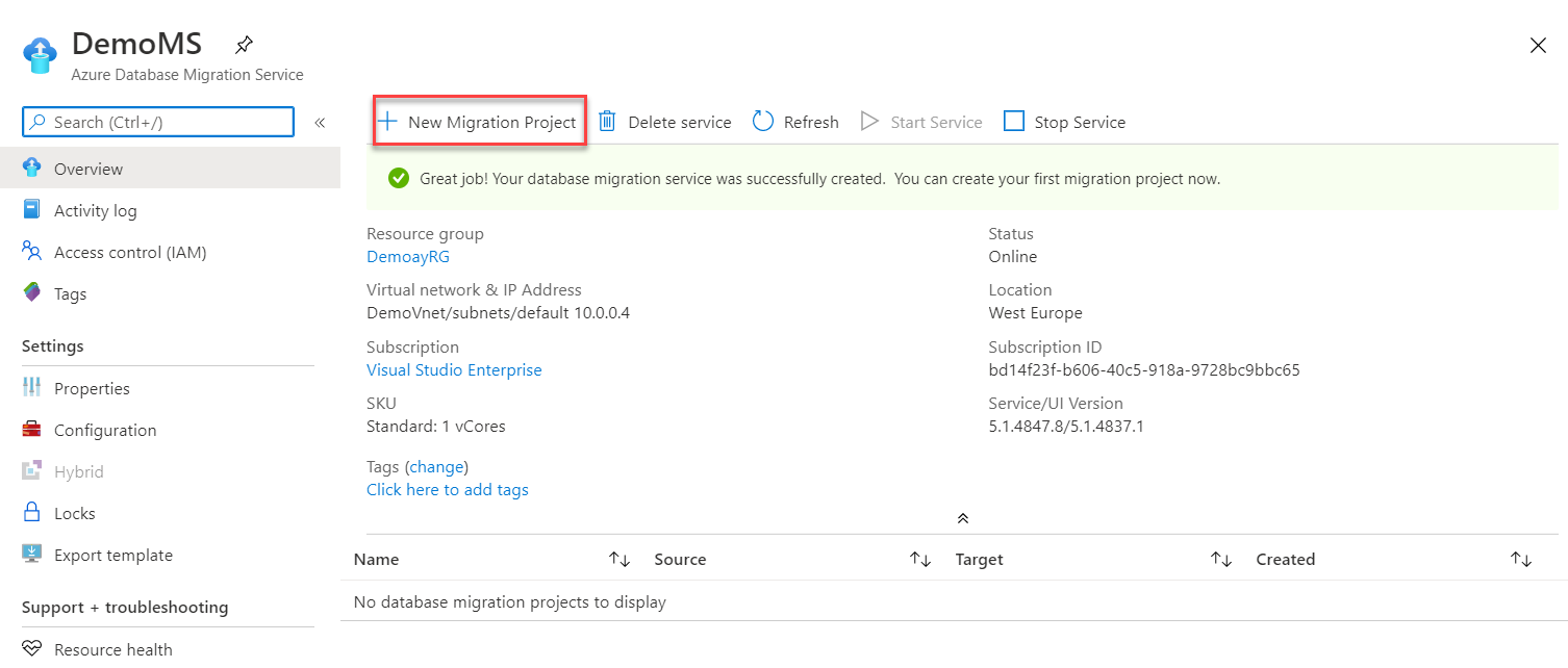 Within a few minutes, the Azure Database Migration Service will be created successfully and ready for a new migration project, as shown below: