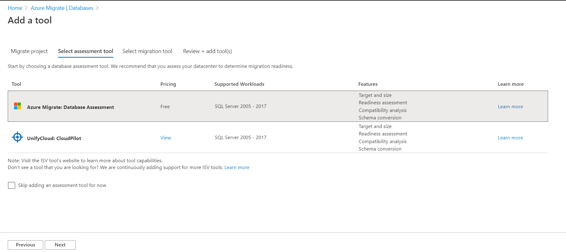After that, you will be asked to select the tools that will be used to assess the databases before migrating it to Azure, as below: