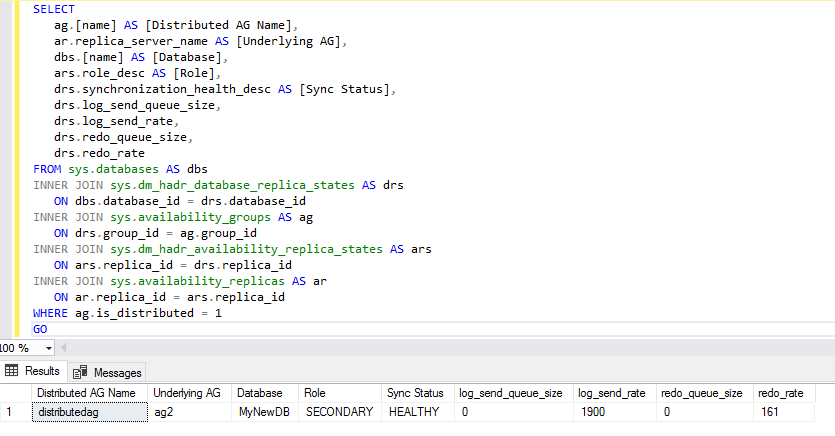 If you connect to the secondary replica of the primary cluster, it does not show the distributed availability group. You do not see it here because the distributed AG configured on the listener URL that always connects with the primary replica. Your database [MyNewDB] is in the synchronized state as well.