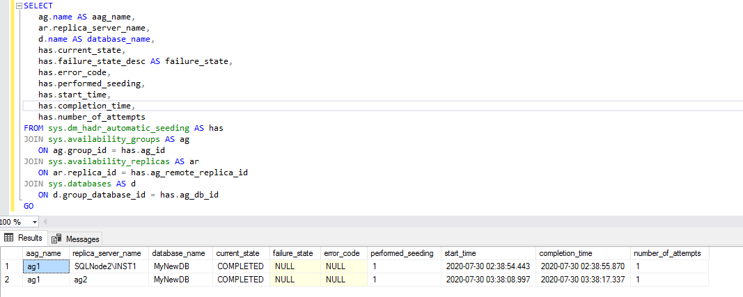 We can see the automatic seeding status, its start and end time, source to destination replica in the below image. It uses an additional DMV sys.dm_hadr_automatic_seeding to monitor sync status. It shows NULL for the failure_state and error_code because our automatic seeding is successful.
