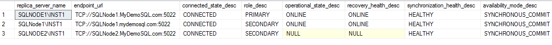 In the below output, we can see underlying availability group configurations details such as endpoint_url, connected state, synchronization health, failover mode.