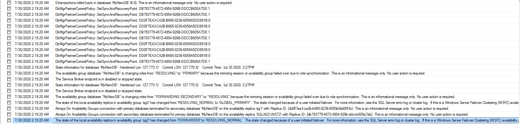 It also causes a distributed availability group to reestablish the connections from the global primary. During the failover, the transactions could not move from the global primary to the forwarder. You can see similar events in the SQL Server logs.