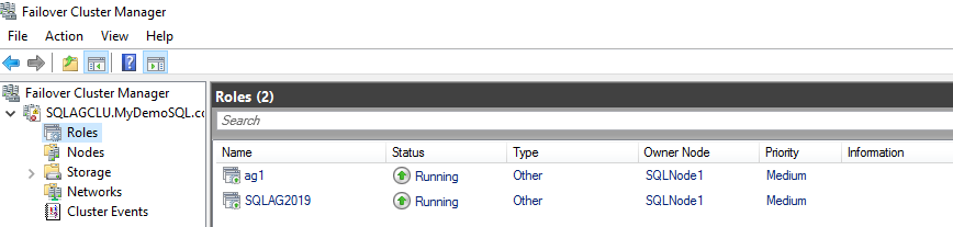 Let’s perform a failover from the SQLNode1 to SQLNode2. You can note here that both the nodes part of a Windows failover cluster. It affects the [MyNewDB] database that is part of the distributed availability group.