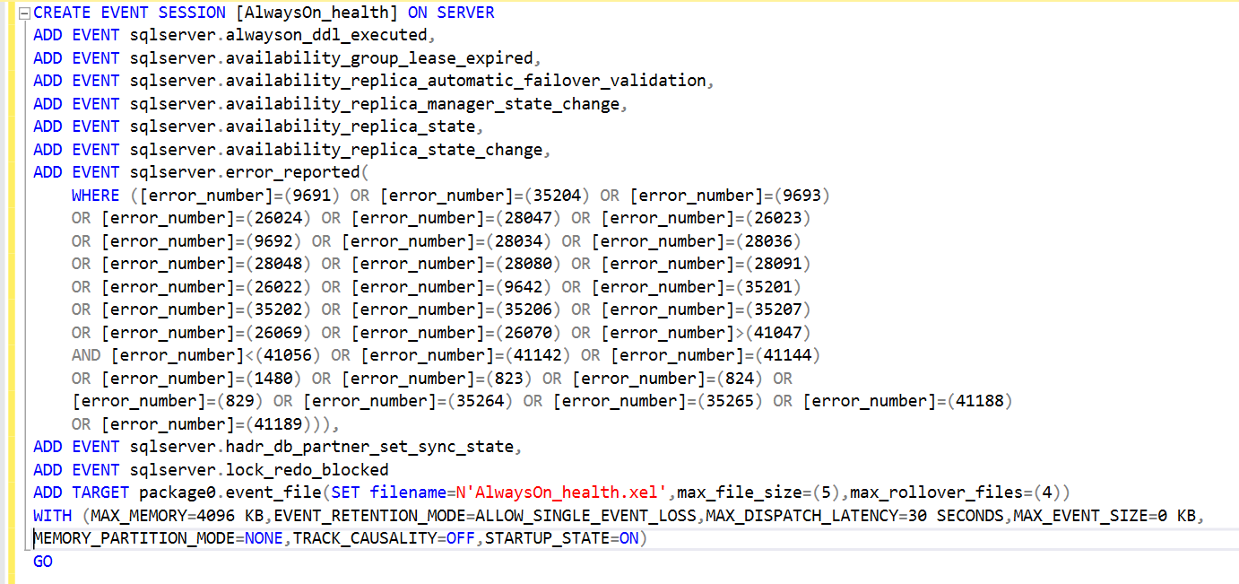 To understand the AlwaysOn_health event session, it is a good idea to script it out. Right-click on the event session-> Script Session as -> Create To-> New Query editor window.
