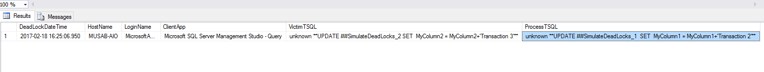 In the table above the most important columns are the Victim and Process TSQL along with the Application name. After executing and getting all the information about the deadlock, now you can do further analysis and fix the problem. I cannot provide a solution for deadlocking as its way more complicated than just identifying the TSQL involved in the deadlock. But this is a good start to remove the deadlocks from the systems.