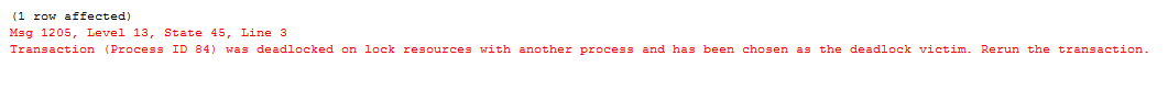 SQL Server chooses process Id 84 as the deadlock victim, and you get the following SQL Server deadlock message in the query window.