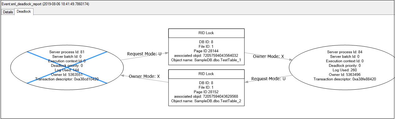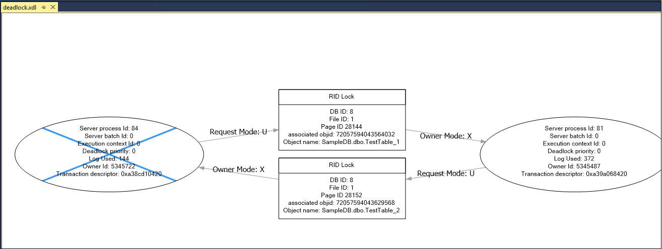 Deadlock Graph: Many times, we want to view the deadlock graph to get the details quickly in a graphical mode. Click on the Deadlock tab, and it shows the following deadlock graph for my demo