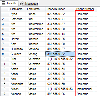 SELECT p.FirstName, p.LastName, PhoneNumber, CASE WHEN ph.PhoneNumber LIKE '[0-9][0-9][0-9]-[0-9][0-9][0-9]-[0-9][0-9][0-9][0-9]' then 'Domestic Phone Number' ELSE 'International Phone number' END PhoneNumber FROM Person.PersonPhone AS ph INNER JOIN Person.Person AS p ON ph.BusinessEntityID = p.BusinessEntityID ORDER BY p.LastName; |