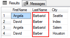 DECLARE @ELastName VARCHAR(20)= 'Barb'; SELECT p.FirstName, p.LastName, a.City FROM Person.Person p JOIN Person.Address a ON p.BusinessEntityID = a.AddressID WHERE p.LastName LIKE '%'+@ELastName+'%'; |
