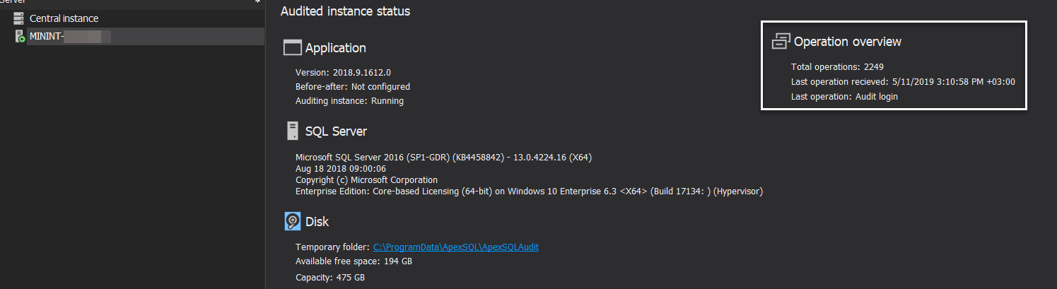 To check if there are actioned captured by the ApexSQL Audit from that server, go back to the Status window and you will see the number of actions that are performed and captured on the selected SQL Server instance, under the Operations Overview below: