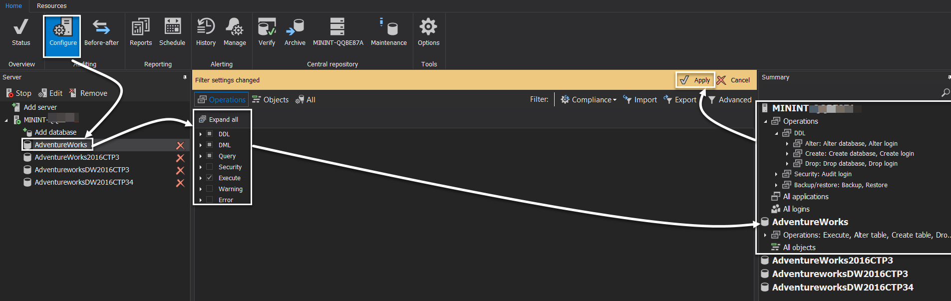 ApexSQL Audit provides us also with a wide range of actions that can be tracked and audited at the SQL Server database level. To audit a specific SQL Server database, choose that database from the databases list under the Server Explorer, click on the Configure button, select the group of actions that you are interested in auditing, includes DML, DDL, Execute and SELECT operations, review your choices in the Summary section then click on the Apply button to save the changes, as shown below: