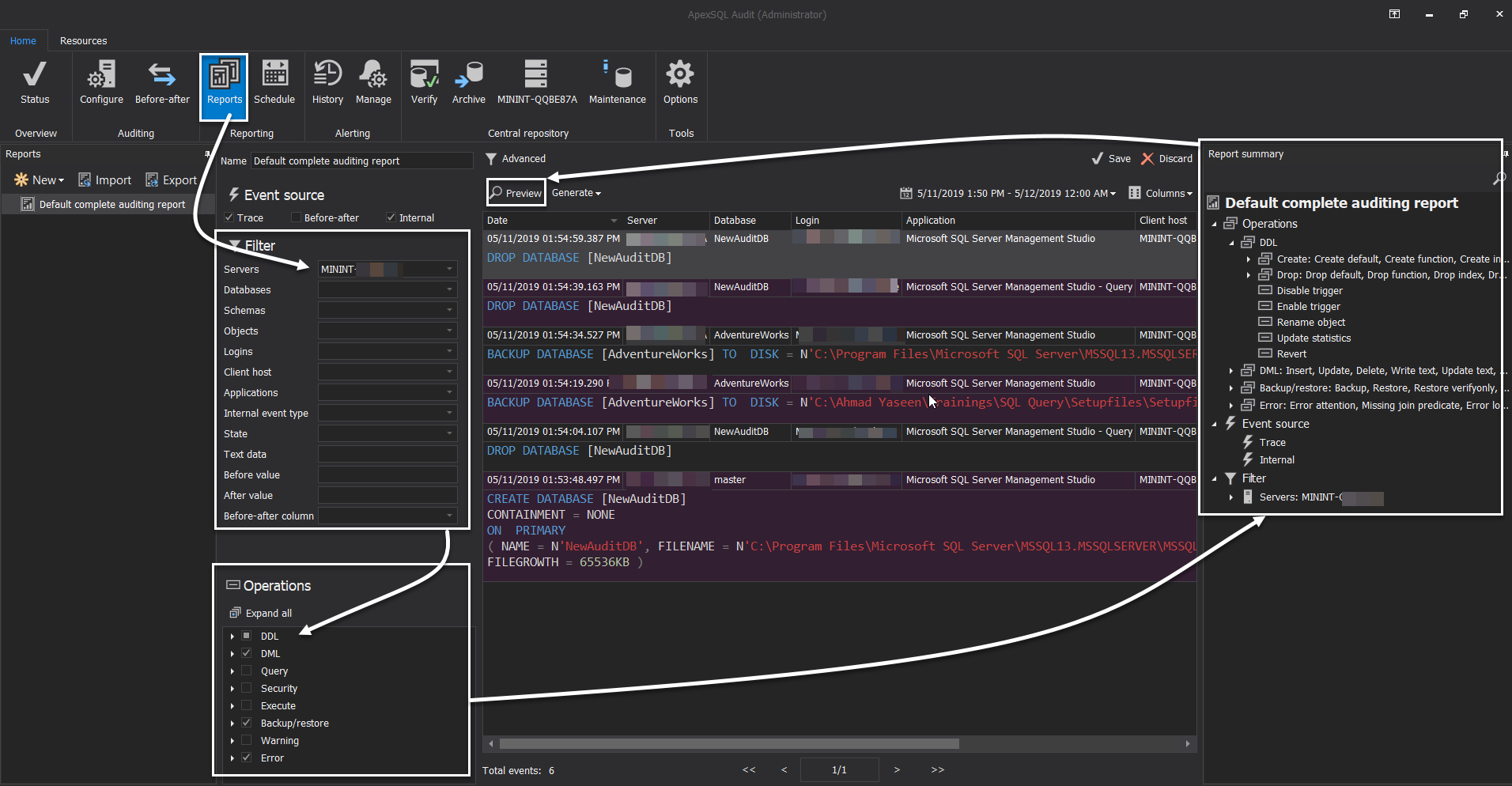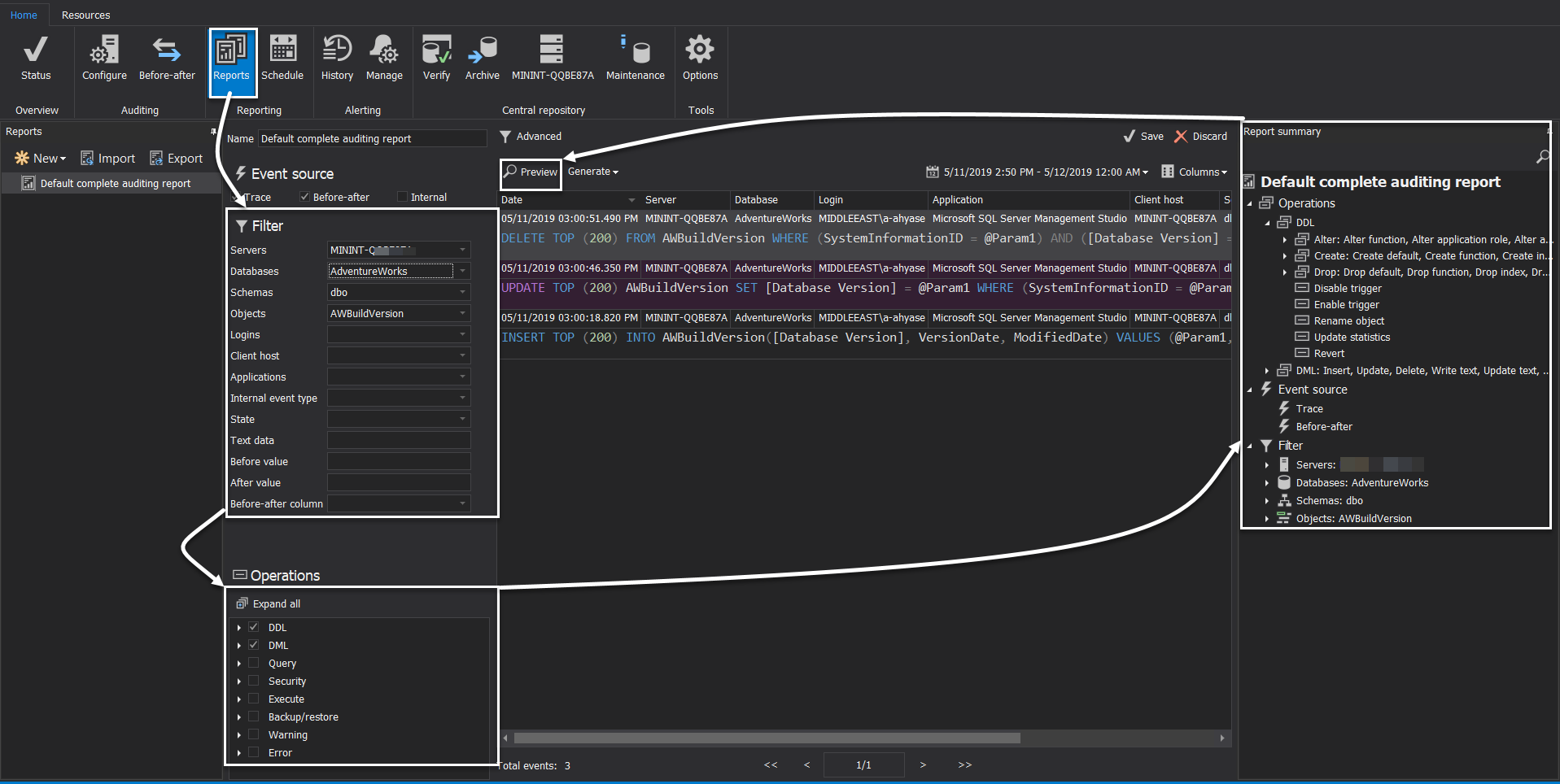 After drawing your criteria, review your SQL Server Audit filter selections from the Report Summary window then click Preview button to display the capture information, based on your filtration or Save button to keep the selected criteria for future use: