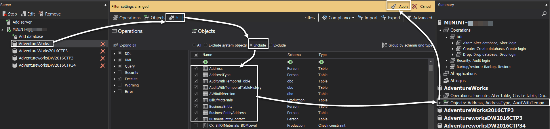 You can also expand your selection by specifying the group of SQL Server Audit actions to be audited per each table. Select your database, click on the All button, then under the Objects section, click Include to specify the list of tables to audit or Exclude to specify the list of tables not to audit. After specifying the tables list, review the choices under the Summary section then click on the Apply button to save your changes, as below: