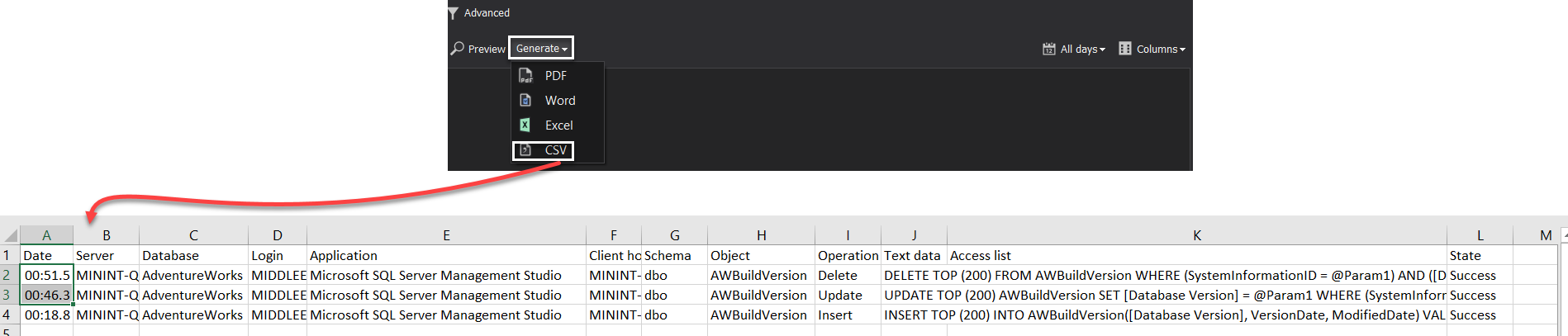 ApexSQL Audit allows us also to export the audit data to different files formats, including PDF, Word, Excel and CSV formats. To achieve that, configure a new report or open an existing report then click on the Generate button and choose from the available files’ formats. In a few seconds, you will see that the generated file will be saved automatically to the ApexSQL Audit folder, and a link to open that file directly will be provided, as shown below:
