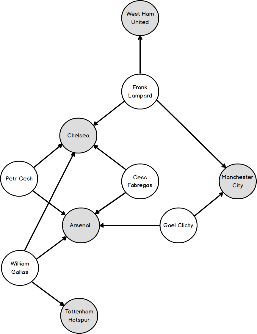 The generated PLVeterans.png image file is shown in Figure 5 wherein we can visualise the data from our sample SQL Server 2017 graph database. The graph indicates that whilst Frank Lampard and William Gallas played for 3 different Premier League clubs to get to their 300+ appearances, Chelsea and Arsenal had the most number of the so-called 300+ players appear in the Premier League through them.