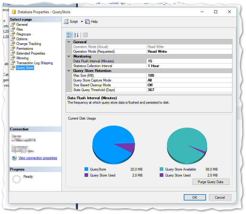 From SQL Server Management Studio, the window look like below when the Query Store is enabled. Also in the bottom of this window, you can see the current disk usage:
