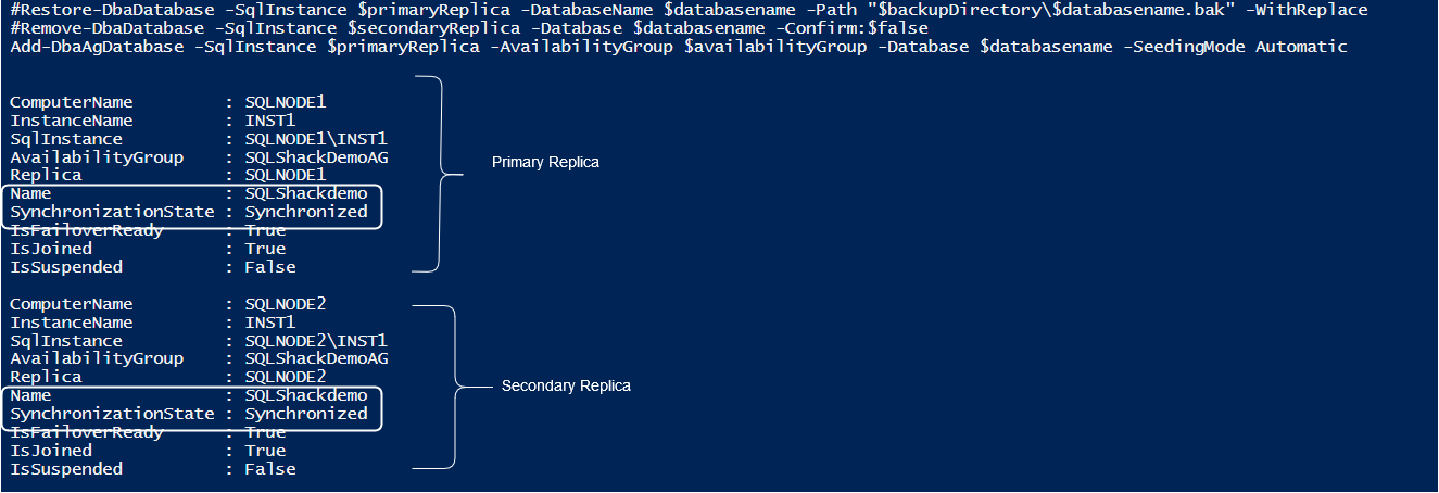 $SQLlistener = "SQLShackLSN" $availabilityGroup = "SQLShackDemoAG" $databasename='SQLShackdemo' $backupDirectory='C:\SQL' $availabilityGroupReplicas = Get-DbaAgReplica -SqlInstance $SQLlistener -AvailabilityGroup $availabilityGroup $primaryReplica = ($availabilityGroupReplicas | Where-Object role -eq 'Primary').Name $secondaryReplica = ($availabilityGroupReplicas | Where-Object role -eq 'Secondary').Name #Remove-DbaAgDatabase -SqlInstance $primaryReplica -AvailabilityGroup $availabilityGroup -Database $databasename Restore-DbaDatabase -SqlInstance $primaryReplica -DatabaseName $databasename -Path "$backupDirectory\$databasename.bak" -WithReplace |
