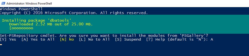 To install the DBATools PowerShell module, run the following command. It downloads the module using an internet connection and installs it. You can refer to the article, DBATools PowerShell Module for SQL Server for detailed information.