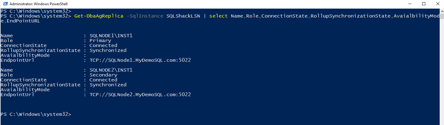$SQLlistener = "SQLShackLSN" $availabilityGroup = "SQLShackDemoAG" $availabilityGroupReplicas = Get-DbaAgReplica -SqlInstance $SQLlistener -AvailabilityGroup $availabilityGroup $primary replica = ($availabilityGroupReplicas | Where-Object role -eq 'Primary').Name $secondaryReplica = ($availabilityGroupReplicas | Where-Object role -eq 'Secondary').Name $primaryReplica $secondaryReplica |