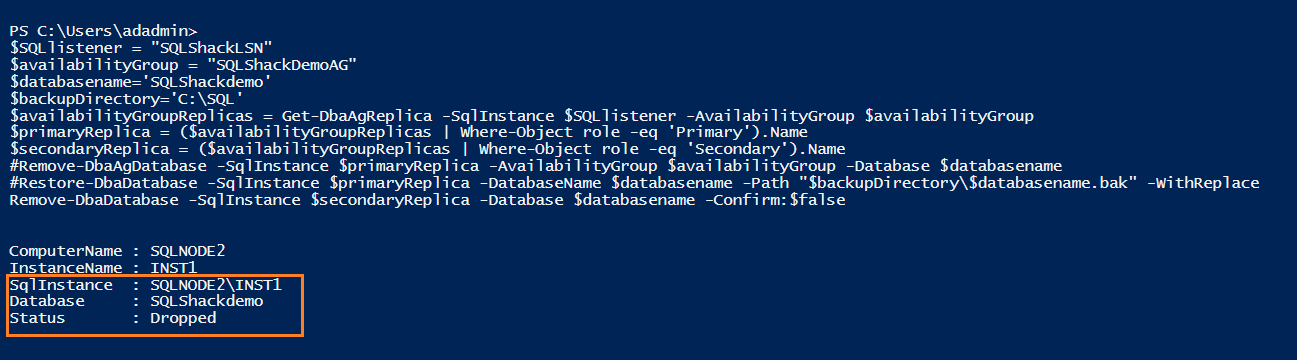 $SQLlistener = "SQLShackLSN" $availabilityGroup = "SQLShackDemoAG" $databasename='SQLShackdemo' $backupDirectory='C:\SQL' $availabilityGroupReplicas = Get-DbaAgReplica -SqlInstance $SQLlistener -AvailabilityGroup $availabilityGroup $primaryReplica = ($availabilityGroupReplicas | Where-Object role -eq 'Primary').Name $secondaryReplica = ($availabilityGroupReplicas | Where-Object role -eq 'Secondary').Name #Remove-DbaAgDatabase -SqlInstance $primaryReplica -AvailabilityGroup $availabilityGroup -Database $databasename #Restore-DbaDatabase -SqlInstance $primaryReplica -DatabaseName $databasename -Path "$backupDirectory\$databasename.bak" -WithReplace Remove-DbaDatabase -SqlInstance $secondaryReplica -Database $databasename -Confirm:$false |