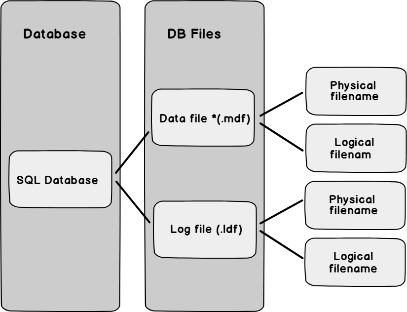 Each database in SQL Server contains at least two files i.e. Data file (*.mdf) and log file (*.ldf). These database files have a logical name and the physical file name. Below we can view the simple architecture of a database in SQL Server.