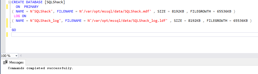 CREATE DATABASE [SQLShack] ON PRIMARY ( NAME = N'SQLShack', FILENAME = N'/var/opt/mssql/data/SQLShack.mdf' , SIZE = 8192KB , FILEGROWTH = 65536KB ) LOG ON ( NAME = N'SQLShack_log', FILENAME = N'/var/opt/mssql/data/SQLShack_log.ldf' , SIZE = 8192KB , FILEGROWTH = 65536KB ) GO |