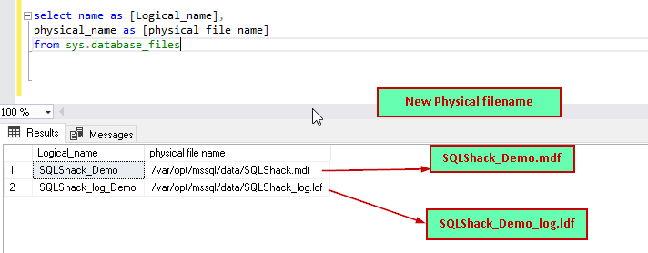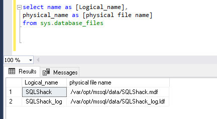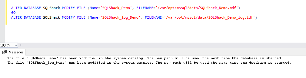 ALTER DATABASE SQLShack MODIFY FILE (Name='SQLShack_Demo', FILENAME='/var/opt/mssql/data/SQLShack_Demo.mdf') GO ALTER DATABASE SQLShack MODIFY FILE (Name='SQLShack_log_Demo', FILENAME='/var/opt/mssql/data/SQLShack_Demo_log.ldf') GO |
