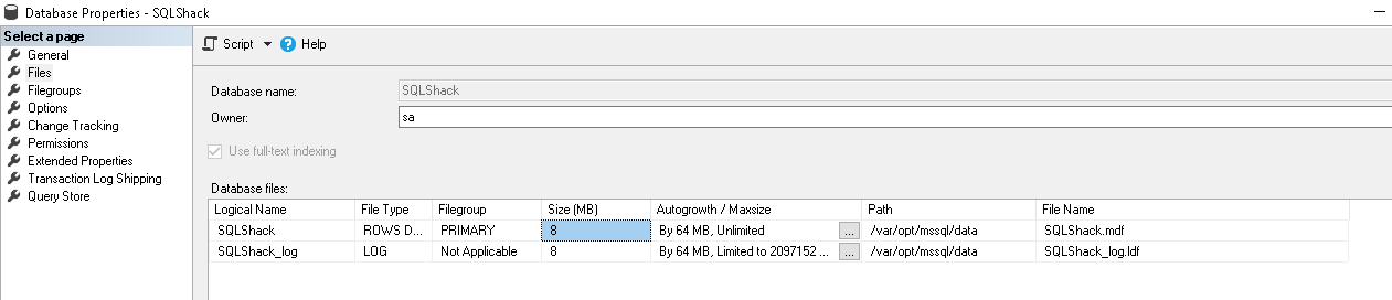 In the files page, we can view all the database files and their properties like file group, size, auto growth etc.