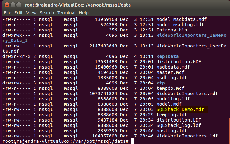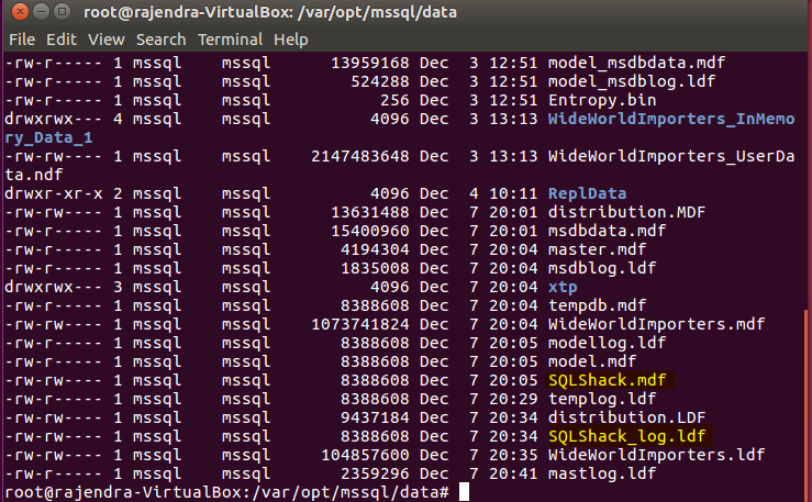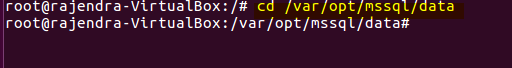 Open the terminal and go to the directory ‘var/opt/mssql/data’. Use the command below to go to the path.