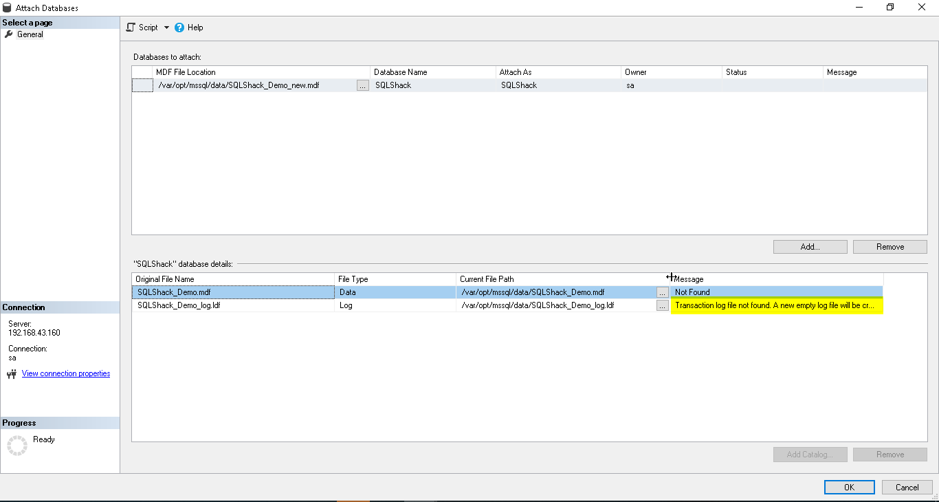 It searches for the old .ldf file in the location. We have already changed the file name, therefore, SQL Server could not locate the log file. It gives the message ‘Transaction log was not found’.