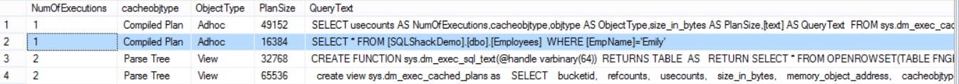 SELECT usecounts AS NumOfExecutions,cacheobjtype,objtype AS ObjectType,size_in_bytes AS PlanSize,[text] AS QueryText FROM sys.dm_exec_cached_plans CROSS APPLY sys.dm_exec_sql_text(plan_handle) |