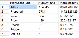 SELECT objtype AS [PlanCacheType], COUNT_BIG(1) AS [NumOfPlans], SUM(CAST(size_in_bytes AS DECIMAL(18, 2))) / 1024 / 1024 AS [PlanSizeInMB] FROM sys.dm_exec_cached_plans GROUP BY objtype ORDER BY NumOfPlans desc GO |