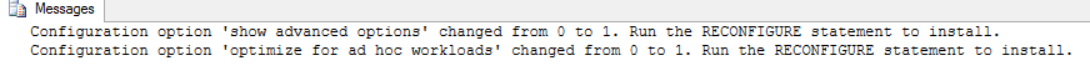 The below message will be displayed after executing the previous command showing that the show advanced and Optimize for Ad hoc Workloads option options are enabled as their values are changed from 0 to 1: