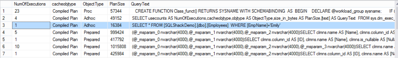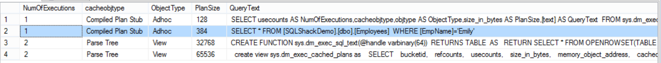 The result will show us that the Compiled Plan Stub for that query is replaced by full compiled plan with size 16 KB that is executed only once. Running the query again and again, the number of executions will be increased indicating that the query that is executed frequently will use the same query plan that is stored in the plan cache, so we are not wasting the plan cache storage for a query that is used once: