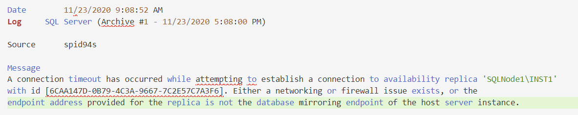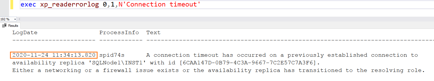 To troubleshoot the connection timeout, check the SQL Server error log on the primary replica. In the below image, we see that it recorded a connection timeout error at 2020=11-24 11:34:13 AM.