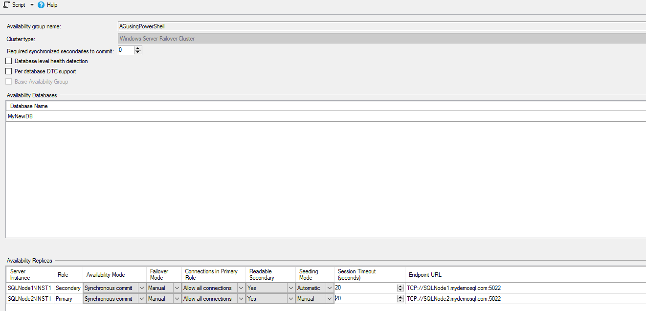USE [master] GO ALTER AVAILABILITY GROUP [AGusingPowerShell] MODIFY REPLICA ON N'SQLNode1\INST1' WITH (SESSION_TIMEOUT = 20) GO USE [master] GO ALTER AVAILABILITY GROUP [AGusingPowerShell] MODIFY REPLICA ON N'SQLNode2\INST1' WITH (SESSION_TIMEOUT = 20) GO |